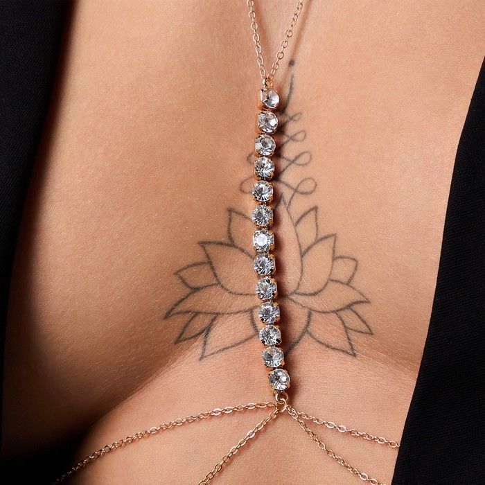 Оригинальное украшение на грудь со стразами выполнено из тонких цепочек и декорировано стразами.