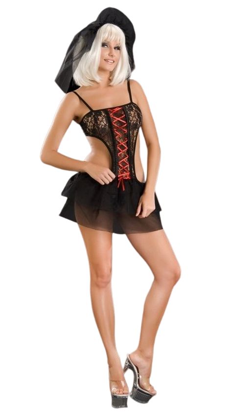 Женский костюм готической невесты состоит из кружевного боди с юбочкой из полупрозрачного фатина и вуали на голову. В комплекте: боди с юбкой, вуаль на голову.