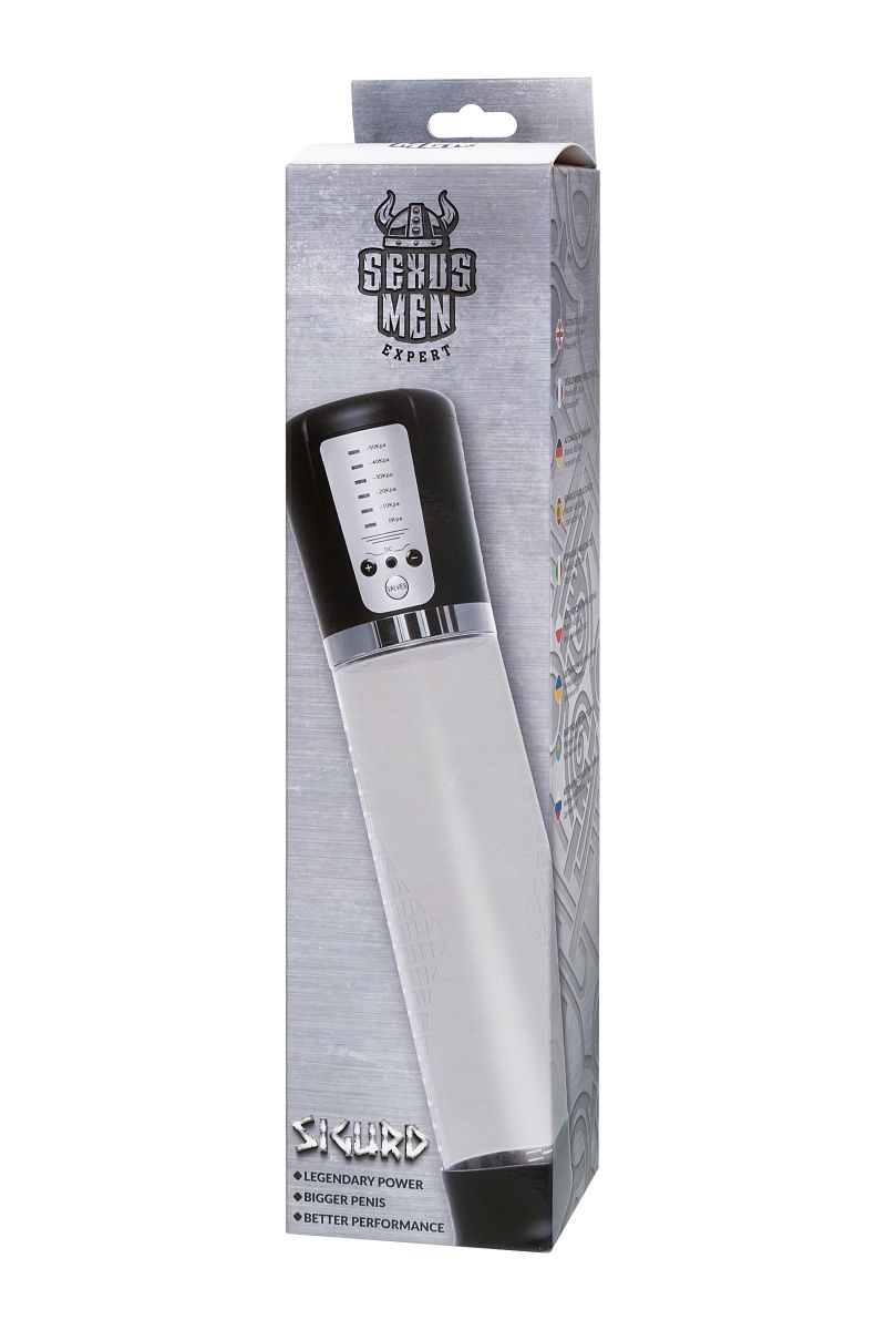 Автоматическая помпа на аккумуляторе Sigurd – для самых требовательных мужчин, которые стремятся к легендарной мужской силе. Сексуальное могущество для мужчины – не только крепкая и надежная эрекция, но и внушительный размер орудия. С автоматической помпой Sigurd серии Sexus Men Expert возможно достичь впечатляющих результатов в области увеличения размеров пениса, занимаясь пенбилдингом по эффективной программе тренировок. Для тренировки, а также чтобы подготовить себя к длительному и яркому сексу, вставьте свой пенис в колбу и откачайте воздух. С помпой Sigurd не нужно прилагать усилий для создания вакуума, она сделает это за вас комфортно и безопасно. Помпа имеет 5 уровней давления, которые регулируются кнопками +/ - на колбе с на LCD-индикаторами 10/20/30/40/50 Кпа. После сброса давления кнопкой Valves умное устройство само откачает воздух до заданного режима, остановится, и будет держать заданный уровень. Благодаря отрицательному давлению увеличивается приток крови к половому члену. Прозрачный ABS-пластик позволяет наблюдать как пенис набирает силу и увеличивается в размере. А измерительная шкала помогает отслеживать результаты прямо в процессе. Для достижения ощутимых результатов рекомендуются систематические занятия по программе эффективного тренинга, которая входит в комплект. Регулярное использование вакуумной помпы Sigurd от Sexus Men позволяет: последовательно увеличить длину и диаметр полового члена, делая его более внушительным и прокаченным сделать эрекцию более стабильной, крепкой и продолжительной повысить сексуальную выносливость и половое влечение поднять уверенность в своих возможностях и совершать новые сексуальные подвиги понизить вероятность образований аномальных фиброзных тканей. Помпа Sigurd комплектуется программой тренировок и USB-проводом для зарядки. Порядок работы помпы: -Включение: коротким нажатием на кнопку «+» помпа включается на нулевом уровне, загорается синий индикатор 0 Kpa -Повышение уровней: коротким нажатием на кнопку «+» последовательно повышайте уровни откачки воздуха. Шаг – 10 Kpa, красные индикаторы загораются рядом с отметками давления в помпе. Помпа останавливается на заданном уровне и поддерживает указанный индикатором уровень давления. Если вы сбросите давление кнопкой «VALVES», помпа автоматически откачает воздух до заданного уровня. -Понижение уровней: сбросьте давление кнопкой «VALVES», а затем коротким нажатием на кнопку «-» последовательно понижайте уровни давления в помпе. Шаг – 10 Kpa, красные индикаторы загораются рядом с отметками давления в помпе. Помпа останавливается на заданном уровне и поддерживает указанный индикатором уровень давления. -Сброс давления: кнопкой «VALVES» помпа сбрасывает давление в колбе. Если вы не понизили уровень, то помпа автоматически восстановит его до указанного красным индикатором. -Выключение: последовательно понижайте уровни кнопкой «-» до 0 Kpa, отмеченного синим индикатором. Через 5 секунд помпа отключится сама. Перед тем, как извлечь член из помпы, сбросьте давление кнопкой «VALVES». Длина колбы - 20 см