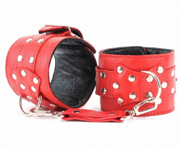 Красные наручники из натуральной кожи. Застегиваются при помощи массивных пряжек.