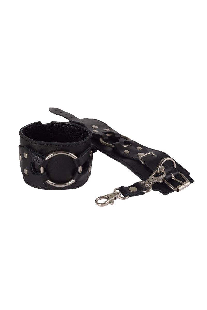Черные наручники из натуральной кожи помогут ограничить движения секс-партнёра, достаточно лишь одеть на запястья комфортный, но прочный девайс. Лаконичные, но при этом красивые наручники подойдут, как для женщин, так и для мужчин, т.к. размер легко регулируется при помощи металлической пряжки. Готические фигурные накладки, удерживающие большое металлическое кольцо, придают наручникам агрессивной сексуальности и роскоши. Соединяются наручники при помощи небольших карабинов, скреплённых кожаной перемычкой. Для комфортного использования внутренняя часть наручников выполнена из бархатистой велюровой кожи. Вся металлическая фурнитура имеет никелевое покрытие. Ширина - 5,5 см.