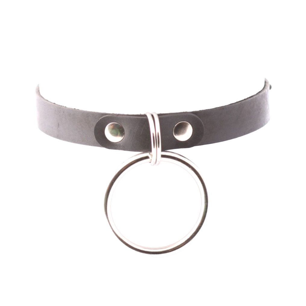 Однослойный чокер из натуральной кожи. Посередине расположен кожаный элемент, на котором прочно закреплено стальное хромированное кольцо. Расположение кольца дает преимущество в разнообразии практического использования чокера во время любовных игр, а классический вид изделия позволяет носить его и в качестве аксессуара для дополнения образа. Общая длина - 40 см. Ширина - 1,6 см. Обхват - 32-40 см.